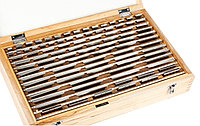 Угловые меры (меры плоского угла) имеют отверстия для крепления приспособлений, стягивающих плитки в блоки. Хранятся меры в специальном боксе, где каждой плашке отведено место, промаркированное размером.