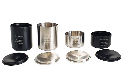 Пикнометр металлический представляет из себя чашку цилиндрической формы и крышку для её закрывания с переливным отверстием по центру для выхода излишков тестируемой жидкости. Пикнометр используется при проведении комплексных испытаний в соответствии с методиками стандартов ГОСТ 28513–90, ГОСТ Р 53654.1-2009, ГОСТ 31992.1-2012 (ISO 2811-1:2011), BS 3900 A19, DIN 53217-2, ASTM 1475, ASTM D 891-B, FTMS 141 4183, ISO 2811-1, JIS K 5600-2-4, NBN T22-110, NFT 30-020. Ближайшие аналоги –пикнометры Elcometer 1800, BYK.